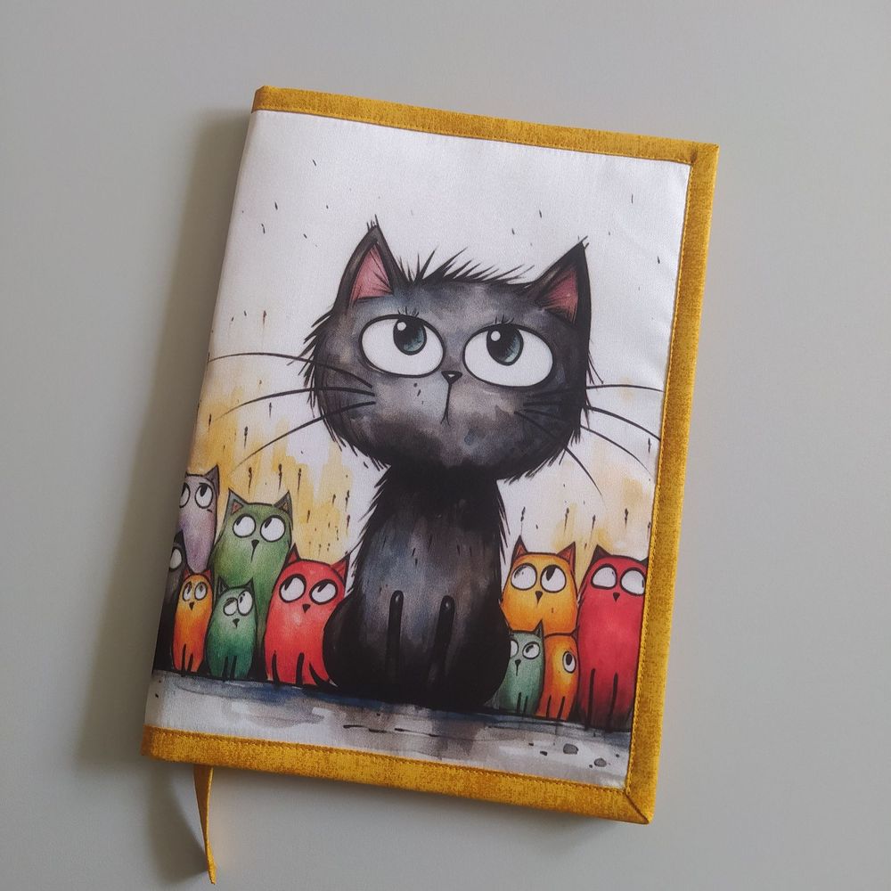Látkový obal "Kočka a barevné kočičky" je originální veselý kabátek na knihu, který určitě potěší každého čtenáře, či čtenářku.