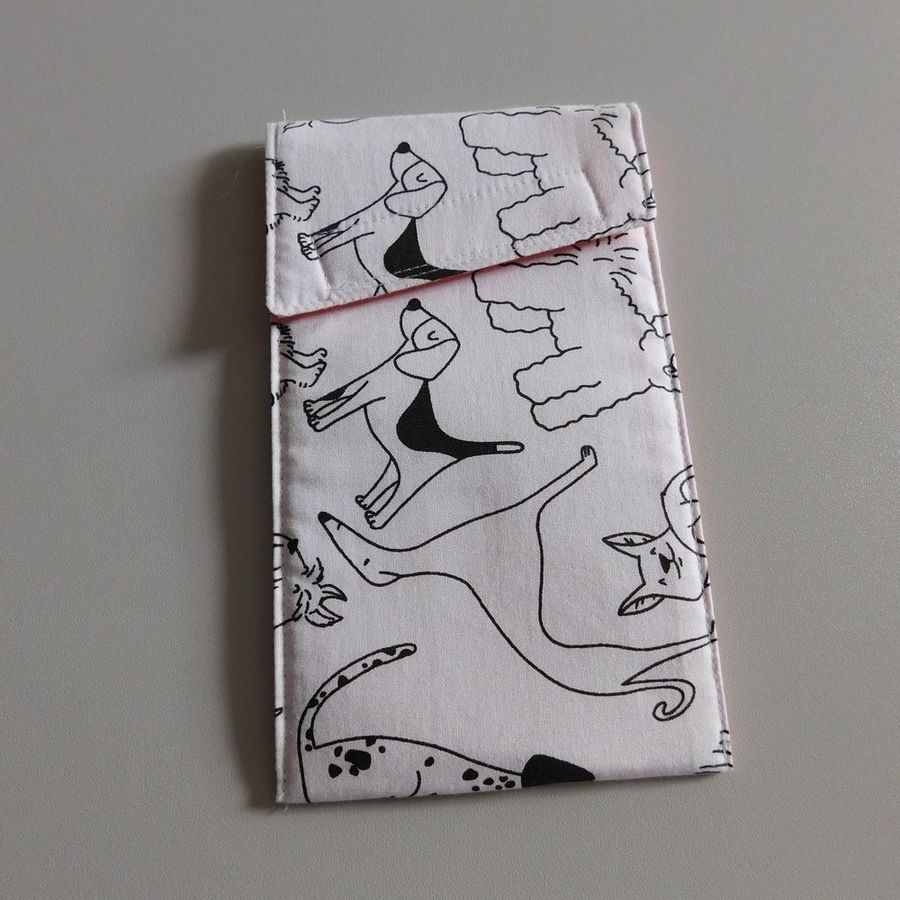 Látkové pouzdro na mobilní telefon s omalovánkou. Má šířku 10 cm, výšku 18 cm a zavírá se na suchý zip. Telefon o šířce 8 cm a tloušťce 1 cm se do něj pohodlně vejde. Pouzdro je vyztužené a má podšívku s barevnými puntíky. Vzhledem k ručnímu položení střihu na látku se může vzor obalu nepatrně lišit.