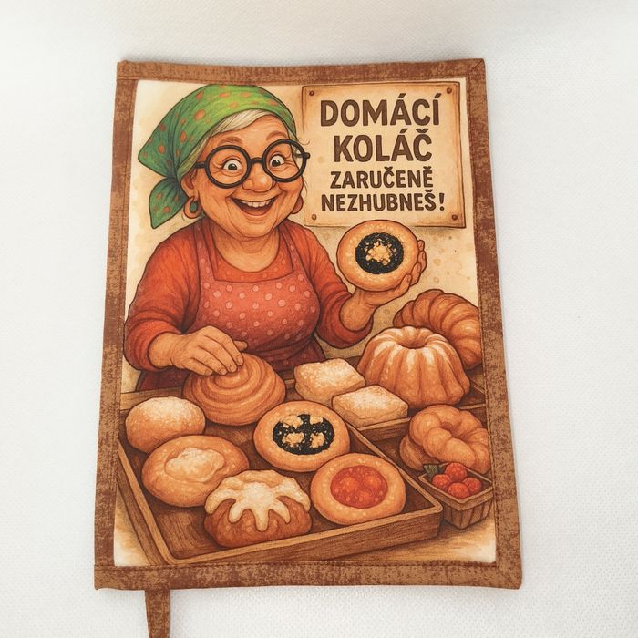 Látkový vtipný obal na knihu "Domácí koláče" je originální, vtipný a veselý kabátek na knihu, který určitě potěší každého čtenáře, či čtenářku.